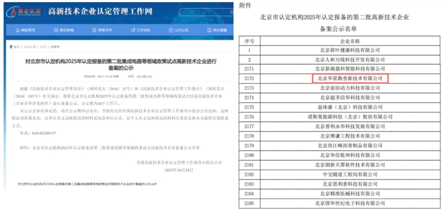 近日,全国高新技术企业认定管理工作领导小组办公室对北京市认定机构2025年认定报备的第二批3170家高新技术企业进行了备案公示,华星公司顺利通过国家高新技术企业资质复审,再次荣获“国家高新技术企业”认定。这标志着华星公司在科技创新能力、核心自主知识产权、科技成果转化能力及企业成长性等方面持续获得国家层面的高度认可与肯定。