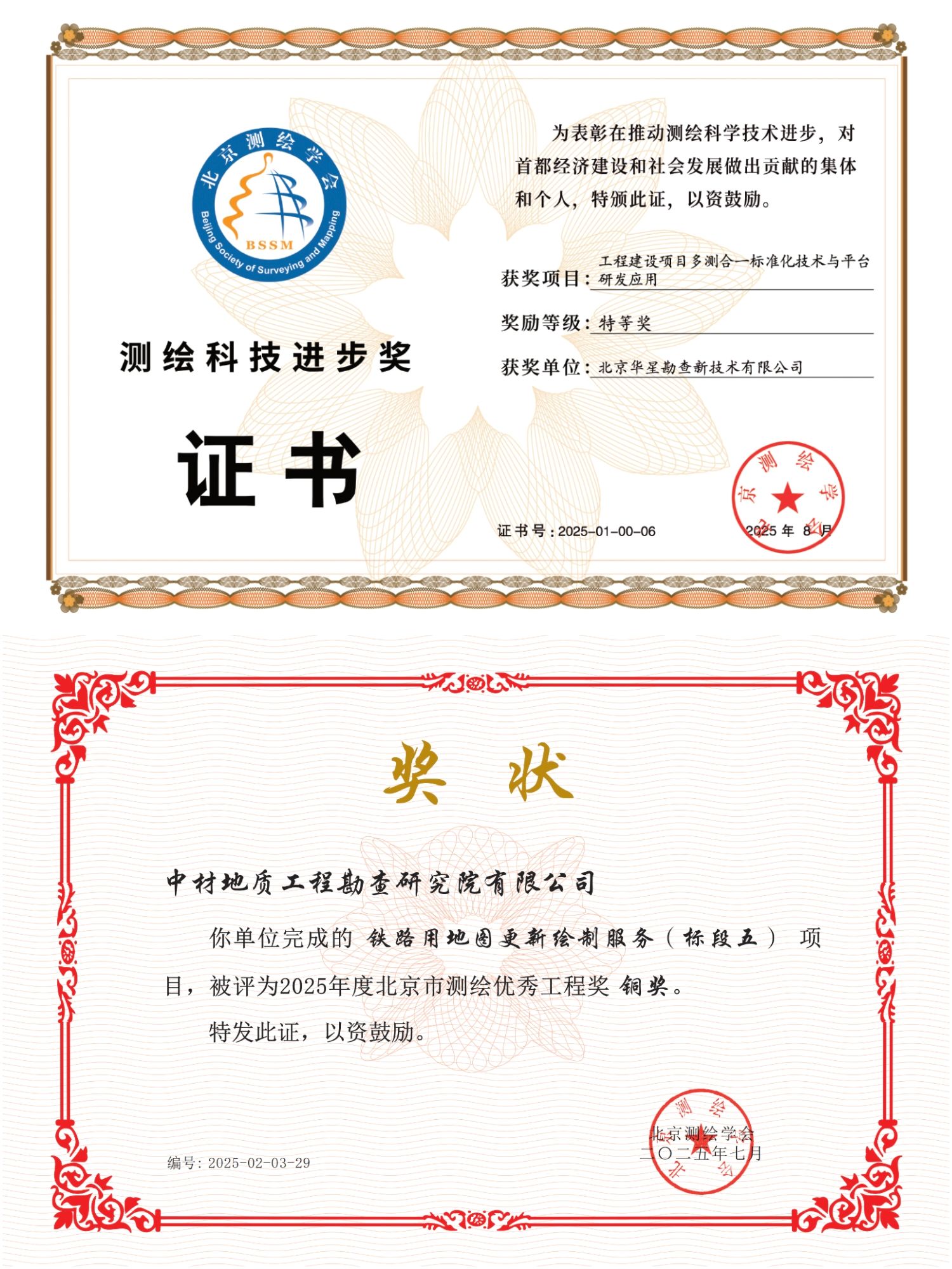 在北京测绘学会年度评选中,测绘院(华星公司)再创佳绩。参与的“工程建设项目多测合一标准化技术与平台研发应用”项目摘得2025年度测绘科技进步奖特等奖。该项目搭建的“多测合一”标准化平台,有效提升了测绘服务效率与数据一致性,为优化营商环境、推进“放管服”改革提供有力技术支撑,具有重要行业示范意义。完成的“铁路用地图更新绘制服务(标段五)”项目荣获北京市测绘优秀工程奖铜奖,项目成果在铁路用地信息化管理中成效显著,为铁路基础设施维护更新提供精准测绘保障,凸显公司在交通工程测绘领域的专业水准。