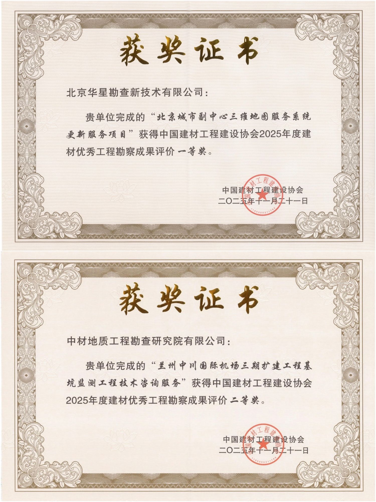 中国建材工程建设协会2025年度建材优秀工程勘察成果评价中,测绘院(华星公司)载誉而归。由其完成的“北京城市副中心三维地图服务系统更新服务项目”斩获一等奖,该项目依托高精度三维建模与动态更新技术,构建起精细化空间数据底座,为城市副中心规划、建设与管理提供关键支撑,尽显公司在数字城市建设领域技术引领力与工程实施硬能力。“兰州中川国际机场三期扩建工程基坑监测工程技术咨询服务”项目荣获二等奖。团队以自动化监测与分析技术,为机场扩建施工安全保驾护航,彰显重大工程监测与风险评估的综合服务能力。